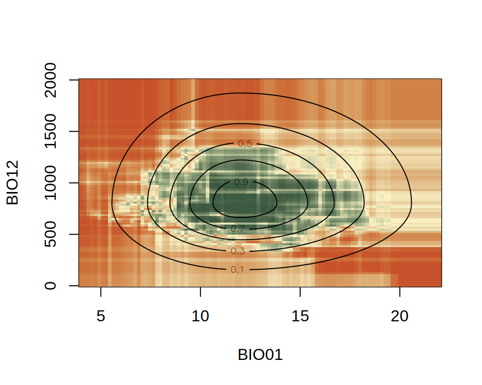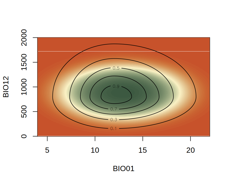 z_inferred <- z# use `x` and `y` generated beforefor (j inseq_along(x)) { z_inferred[j, ] <-predict( enm, newdata =data.frame(BIO01 = x[j], BIO12 = y),type ="response" )}image( x, y, z_inferred,xlab ="BIO01",ylab ="BIO12",col =hcl.colors(100, "Fall", rev =TRUE))contour( x, y, z,add =TRUE,levels =seq(0.1, 1, by =0.2))