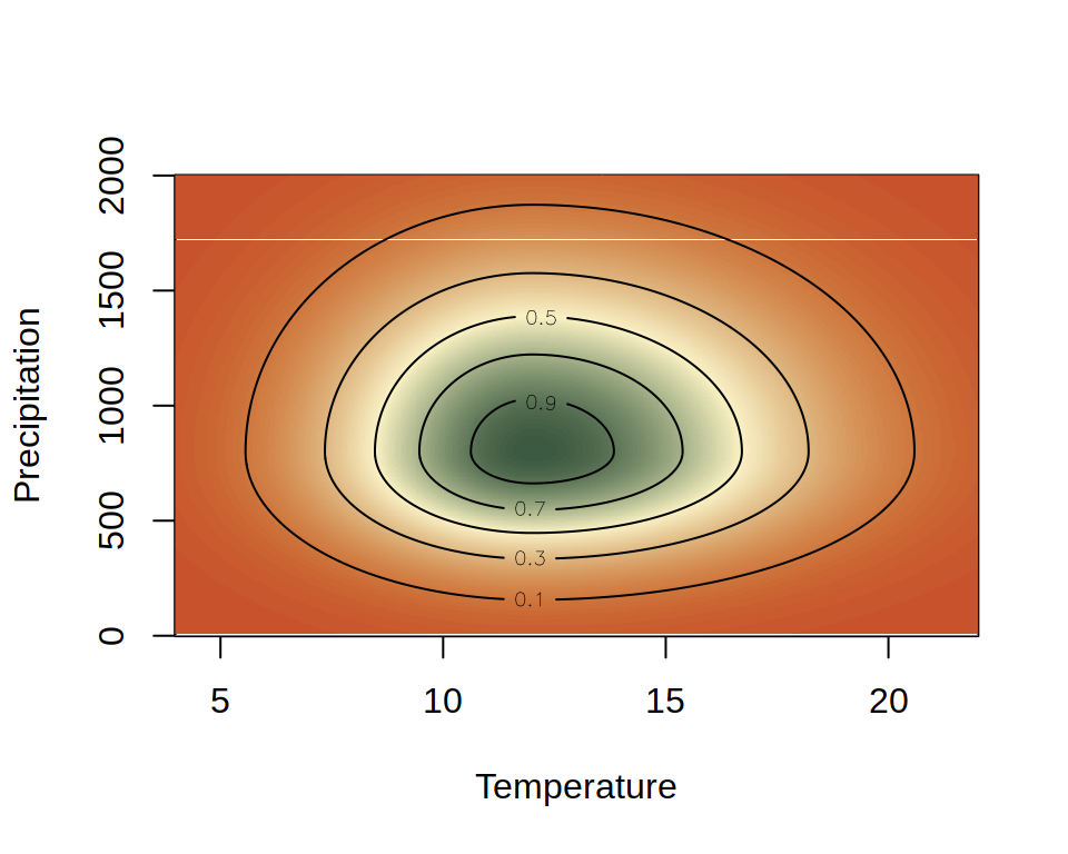 Species usually respond to more than one environmental covariate, making the niche multidimensional. An example of a non-symmetrical convex 2D niche is shown below.