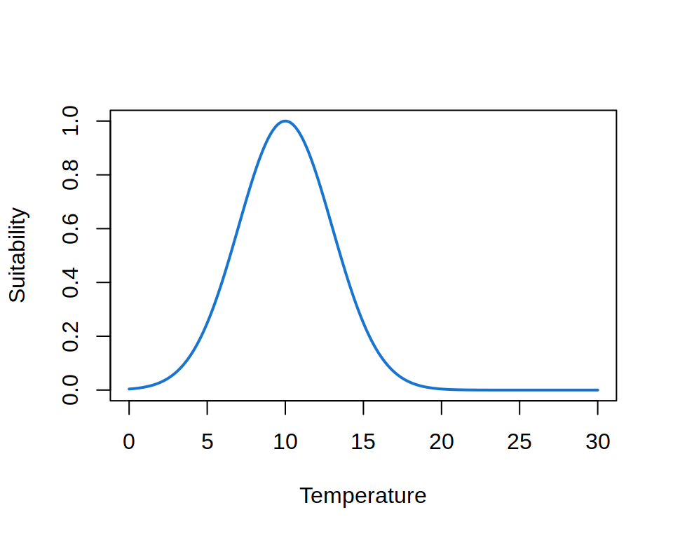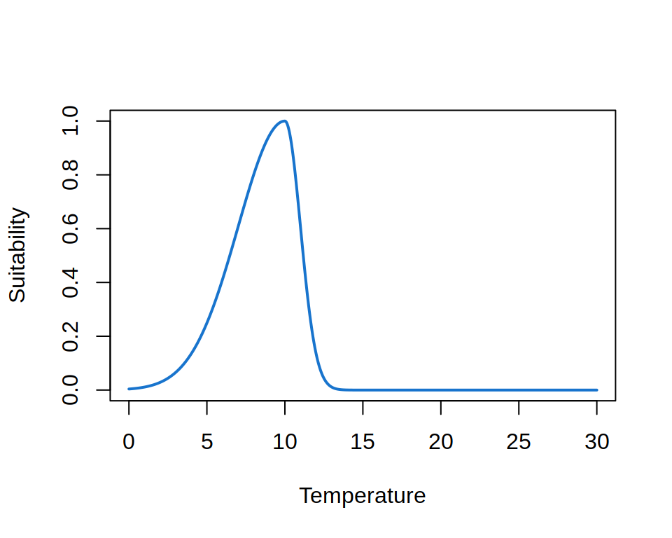 ENM relates one or more environmental variables, e.g. temperature and precipitation, to the suitability of species. The range and shape of how this suitability changes with the variables is called the environmental niche of the species. For example, the figure below shows the thermal niche of a species.