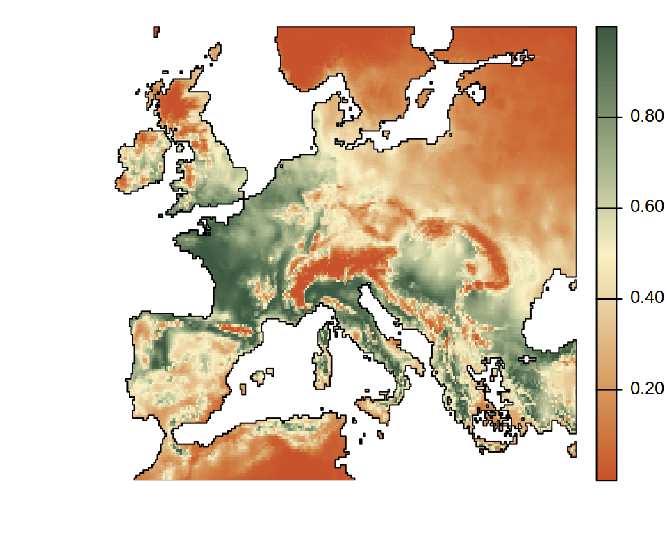 library(terra)roi <-ext(-13, 33, 33, 62) # Europer <-rast(c("../data/wc2.1_10m_bio_1.tif", "../data/wc2.1_10m_bio_12.tif")) |># load rasterscrop(roi) # crop to Europew <- r[[1]]w[!is.na(w)] <-1w <-as.polygons(w)vals <-values(r)l1 <-l(vals[, 1], mu[1], sigl[1], sigr[1]) # first component of the nichel2 <-l(vals[, 2], mu[2], sigl[2], sigr[2]) # second component of the nichesdm <- r[[1]]names(sdm) <-""values(sdm) <- l1 * l2 # multiply two componentsplot( sdm,col =hcl.colors(100, "Fall", rev =TRUE),fun = \() lines(w),axes =FALSE,mar =c(2, 0, 1, 0))