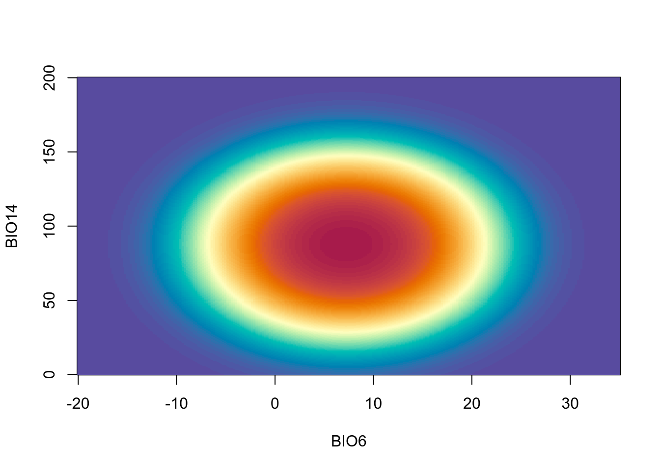 Because of coefficients of ENM-2 are both negative, ENM-2 is both statistically supported and theoretically valid and we can use it for SDMs. Below is the inferred niche of ENM-2.