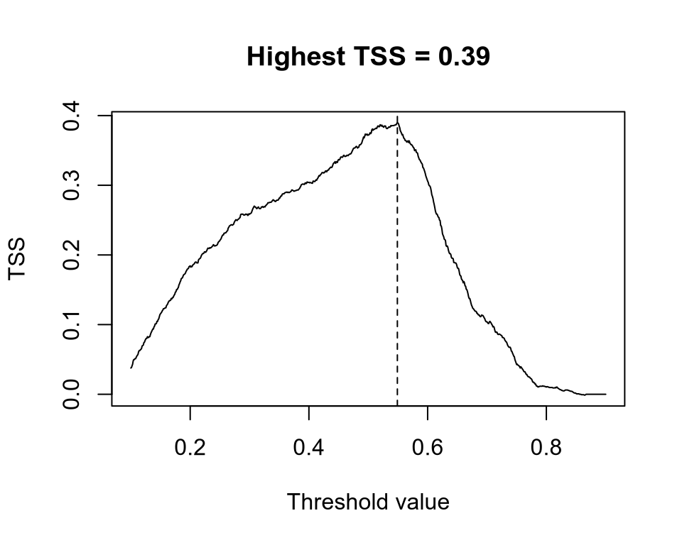 If we pick several threshold and calculate the TSS for each of them, the best threshold is the one that has highest TSS, which is also the TSS of our model predictions.
