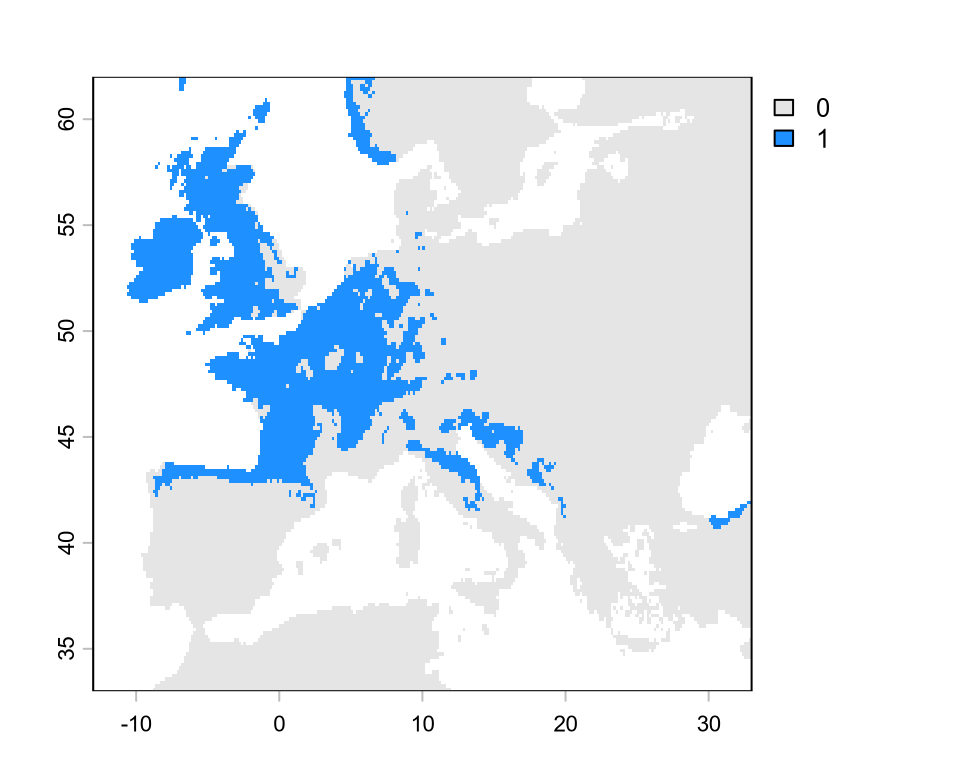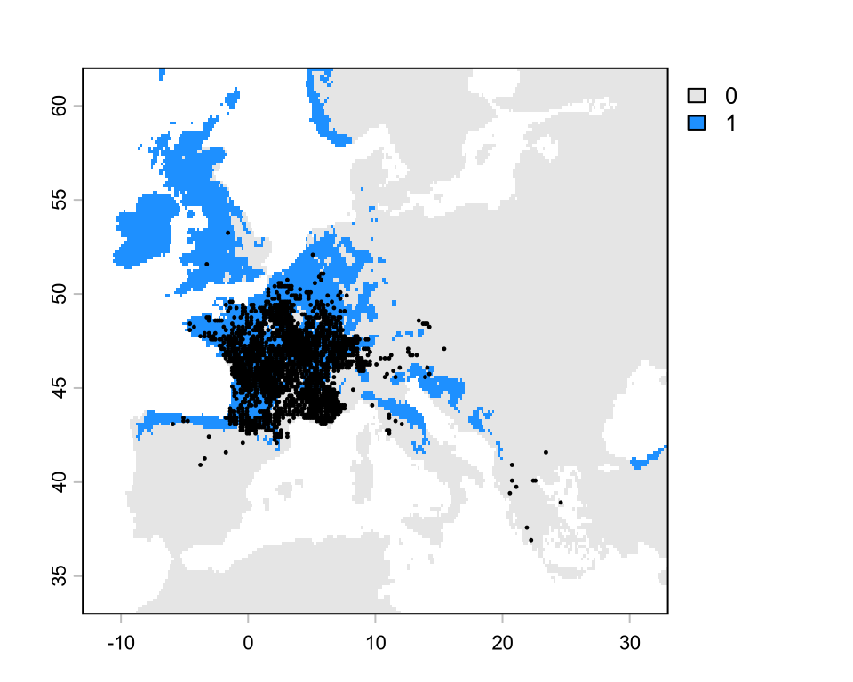 This binary map is quite incorrect for this species. According to the IUCN (https://www.iucnredlist.org/species/61550/12514105), this species is found also in most of Italy, all the Balkans, and part of Turkey, but is not found in the UK, the Low Countries, and most of Germany. Why do we get such bad projections compared to the known range from IUCN? We will answer this in a next lecture, but my general recommendation is to plot the detection points.