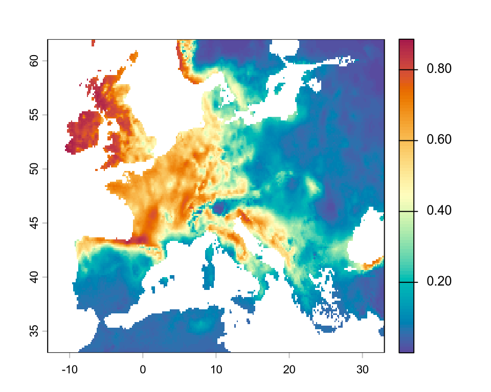 library(terra)ff <-list.files("../data", pattern =".tif") # all files with .tif extensionr <-rast(file.path("..", "data", ff))roi <-ext(-13, 33, 33, 62) # roi of Europer <-crop(r, roi) # crop to Europe